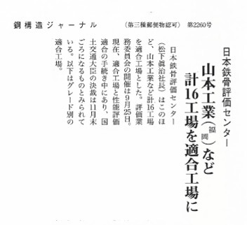 鋼構造ジャーナル 10月6日 第2260号 掲載 弊社はこの度、国土交通大臣認定 鉄骨製作工場「Hグレード」の認定を取得いたしました。...